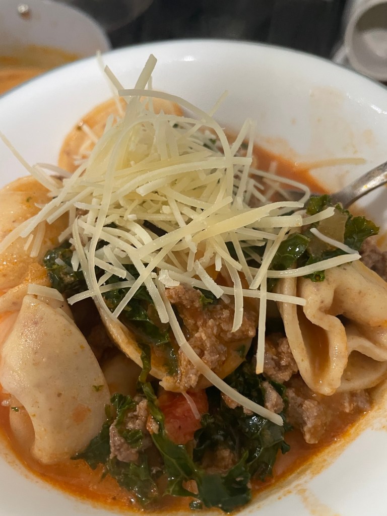 1–1½ lbs ground beef 1 white onion, chopped 2–3 cloves garlic, minced Beef broth or beef bone broth (enough to cover, about 6–8 cups) 4 cups chopped kale Salt & pepper, to taste 1 package cheese tortellini (I use gluten-free) ¼ cup heavy cream
