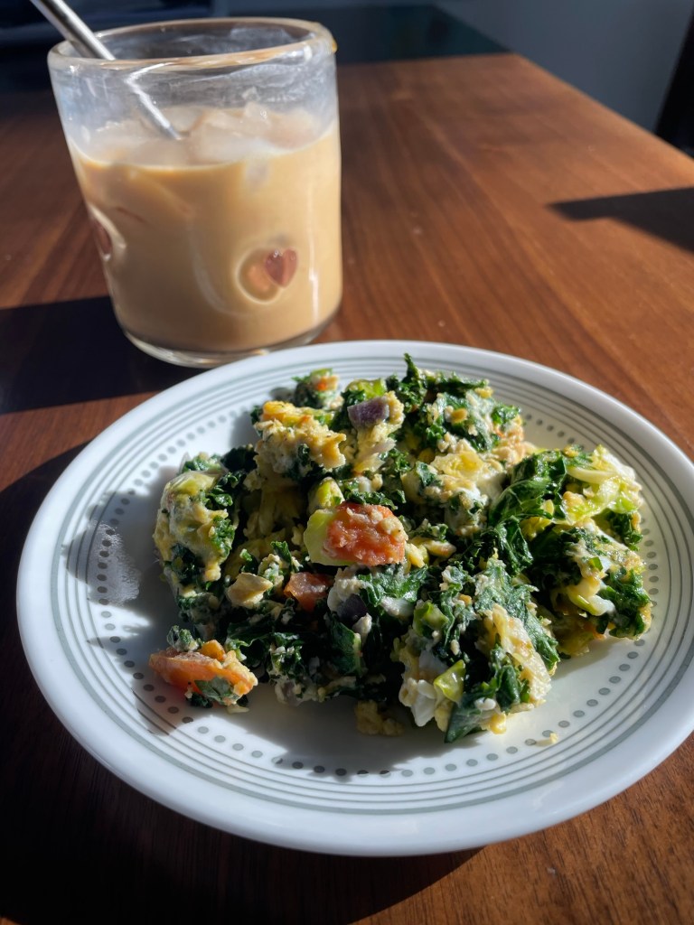 Prep the veggies Finely chop all vegetables so they cook evenly and quickly. Sauté Heat butter or ghee in a skillet over medium heat. Add Brussels sprouts or broccoli first and sauté 2–3 minutes until slightly tender. Add onion and cook until fragrant. Stir in greens and tomato. Season with sea salt, pepper, and garlic powder. Add the eggs Crack 3–4 eggs directly into the pan. Gently scramble everything together, cooking until eggs are just set but still soft. Serve Plate warm and top with a scoop of sauerkraut for a probiotic boost. Serve alongside a fresh slice of sourdough bread. For extra protein and staying power, add cooked bacon or sausage on the side.