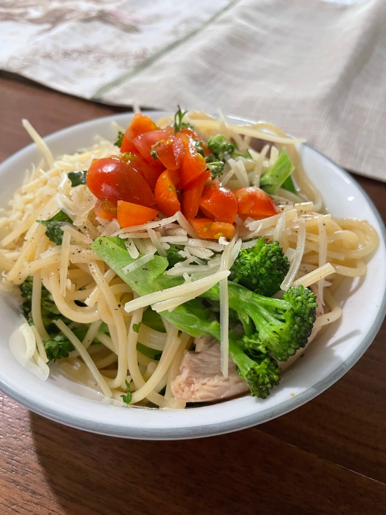 1 lb chicken thighs 1 cup bone broth Salt and pepper, to taste 1 tsp garlic powder 1 tsp onion powder 1 tsp Italian seasoning 1 package organic spaghetti noodles 1–2 tbsp butter 1–2 cups broccoli, sautéed or steamed Freshly grated Parmesan cheese Fresh parsley, chopped